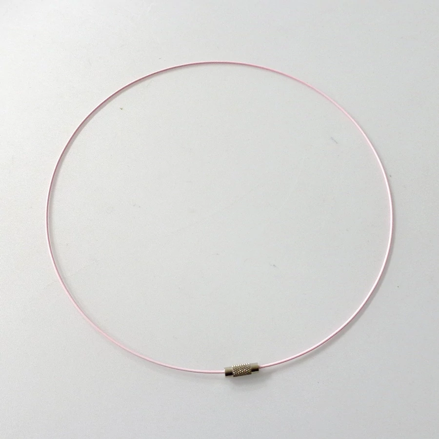 Az acélsodrony kb 1 mm vastagságú és színes műanyag bevonata van. A csavaros vége tekerésével nyitható. Óvatosan levehető a vége, így rá lehet fűzni medálokat, gyöngyöket. Hossza 45 cm.