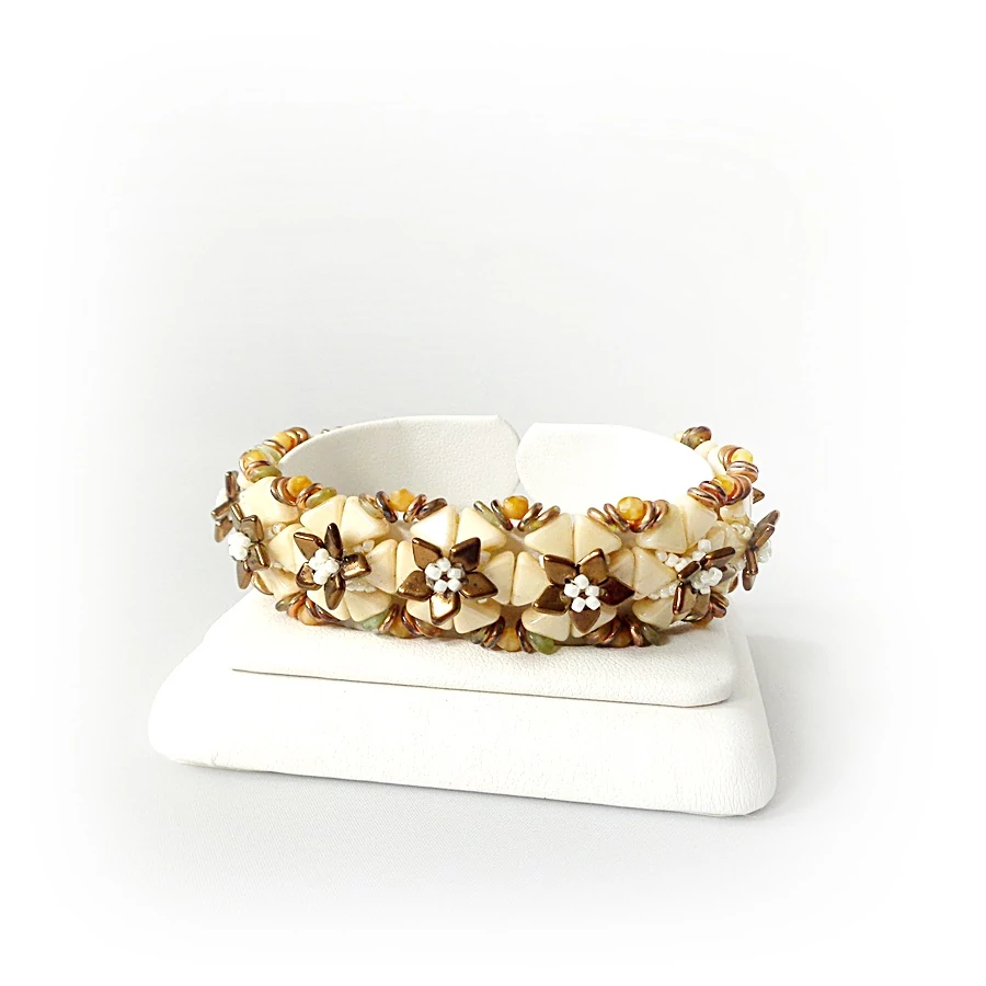 Nagyon aprólékos, több féle minőségi gyöngyökből lett fűzve ez a karkötő. Bronzos-drappos színvilága minden öltözékhez passzol. Hossza 15 cm + 4 cm lánchosszabbító.